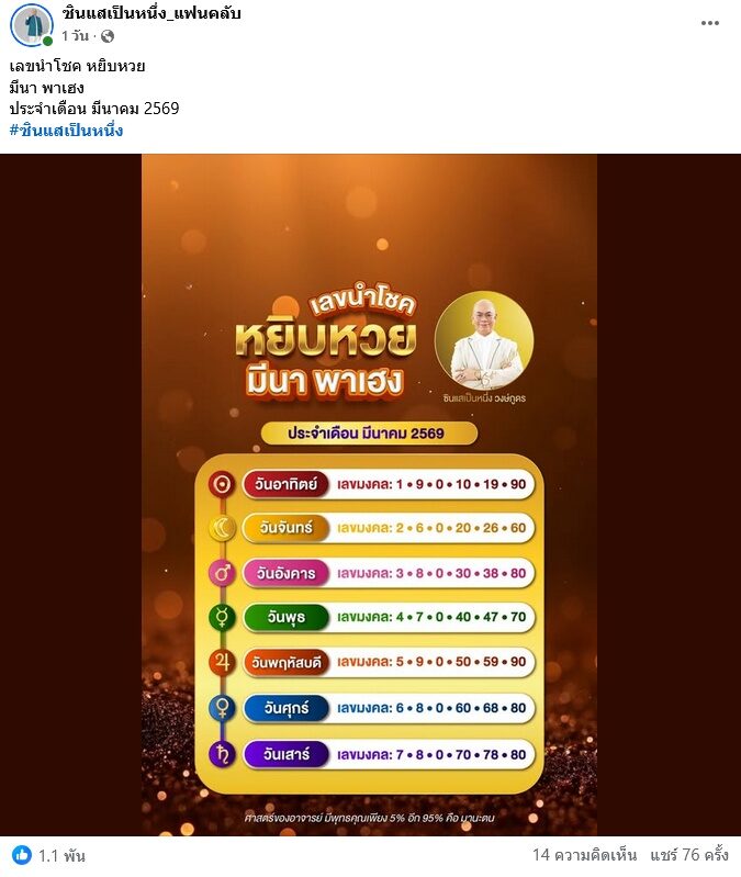 เลขนำโชคของ 7 วันเกิด พาเฮงเดือนมีนาคม 2569 ซินแสเป็นหนึ่ง โพสต์ใกล้วันหวยออกด้วยว่า “เลขนำโชค หยิบหวย มีนา พาเฮง ประจำเดือน มีนาคม 2569” ดังนี้