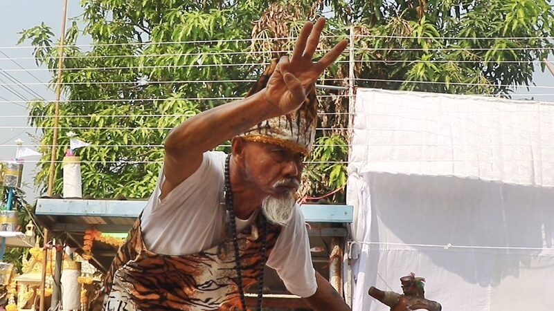ต่อมา อาจารย์พวง ได้เปลี่ยนเป็นชุดพ่อปู่ฤาษีตาไฟ ถือไม้เท้าเดินออกมายังหน้าโต๊ะตั้งเครื่องเซ่นไหว้ ลักษณะเดินก้มตัวงอมือถือไม้เท้าสั่นท่าทางเหมือนคนแก่ คาดว่าพ่อปู่ฤาษีตาได้เข้าสิงร่างแล้ว