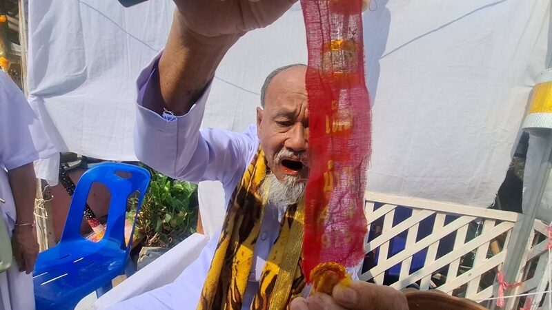 อาจารย์พวง มีอาการคล้ายเหมือนจะร้องไห้ กิริยาท่าทางเปลี่ยนไป น้ำตาไหลตลอดเวลา จากนั้นได้นำเอาธูปเสี่ยงทายขึ้นมาจุดอธิษฐาน และปักลงบนผลไม้ ท่ามกลางความสนใจ อย่างใจจดใจจ่อของชาวบ้านและลูกศิษย์ที่มาเข้าร่วมพิธี